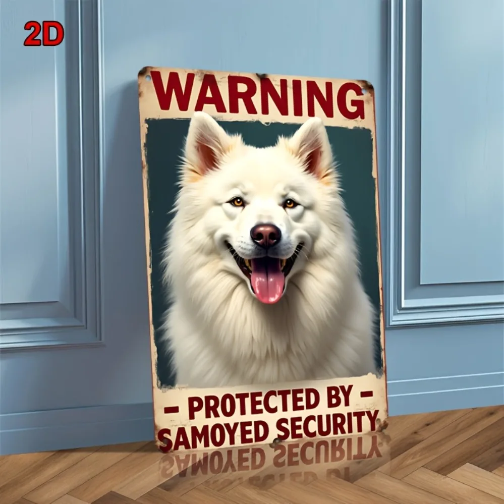 Retro Samoyed Metal Sign - "Emoyed Security Protection" Humorous Warning Decor This rustic iron wall art features